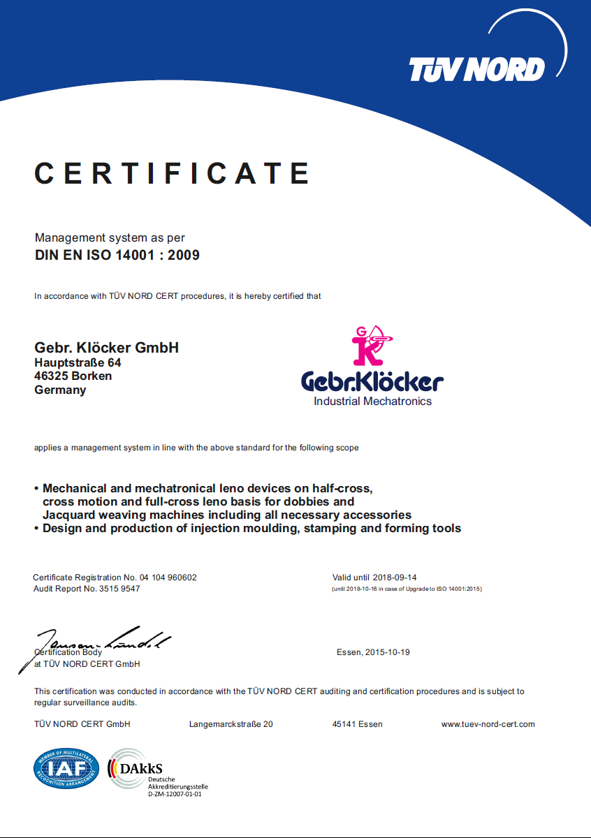 Tindakan yang terus menerus dilakukan untuk pemeliharaan lingkungan pada dasarnya membutuhkan analisis alur material internal. Didasarkan hal ini, Klöcker memperkenalkan sistem manajemen lingkungan sesuai dengan DIN EN ISO 14001 – sertifikasinya telah diperpanjang untuk tiga tahun kedepan oleh Technical Control Board North Cert pada tahun 2015.