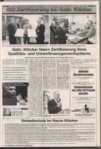 At the turn of the millennium, Klöcker implements a quality and environmental system according to DIN EN ISO 9001 and DIN EN ISO 14001 respectively after having passed the extensive examination through the Technical Inspection Authorities in charge, while the Indonesian site follows the relevant guidelines as well. Numerous guests from economy, politics and administration participate in celebrating the certification.